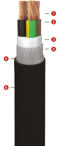 1. ILETKEN : BAKIR 2. IZOLE : PVC 3. DOLGU : PVC 4. ZIRH: GALVANIZLI ÇELIK 5. BAND: GALVANIZLI ÇELIK 6. DIS KILIF : PVC |