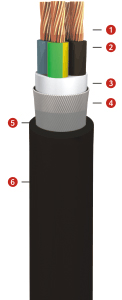 1. ILETKEN : BAKIR 2. IZOLE : PVC 3. DOLGU : PVC 4. ZIRH : GALVANIZLI ÇELIK 5. BAND : GALVANIZLI ÇELIK 6. DIS KILIF : PVC |